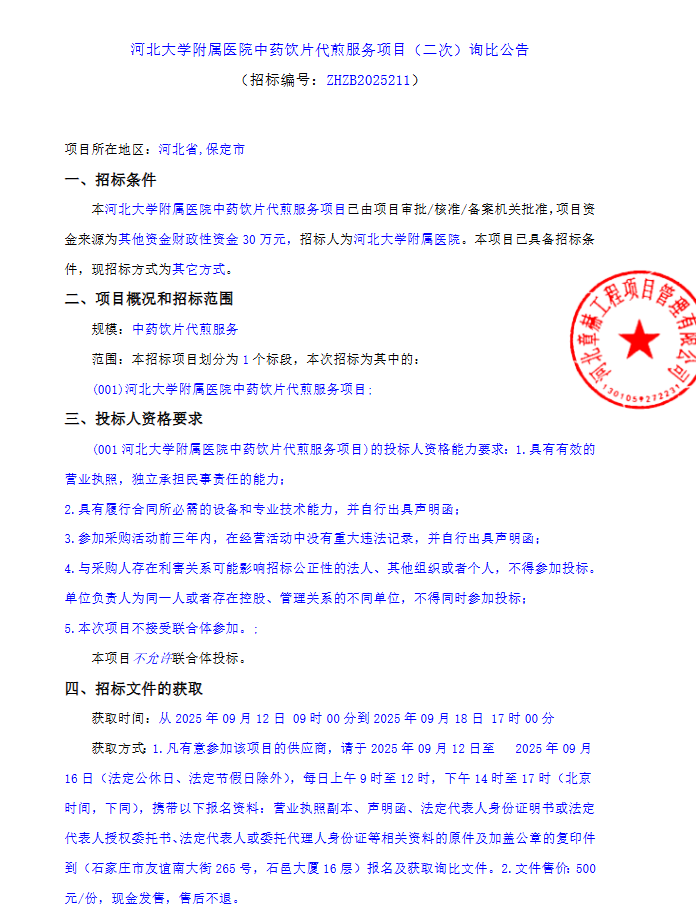 【河北大学附属医院】河北大学附属医院中药饮片代煎服务项目(二次)询比公告