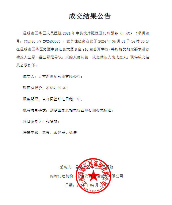 【昆明市五华区人民医院】云南省昆明市五华区人民医院2024年中药饮片配送及代煎服务(二次)成交结果公告