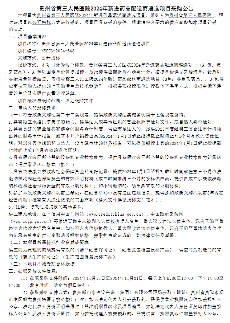 【贵州省第三人民医院】贵州省第三人民医院2024年新进药品配送商遴选项目采购公告