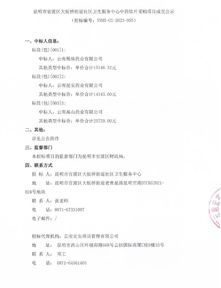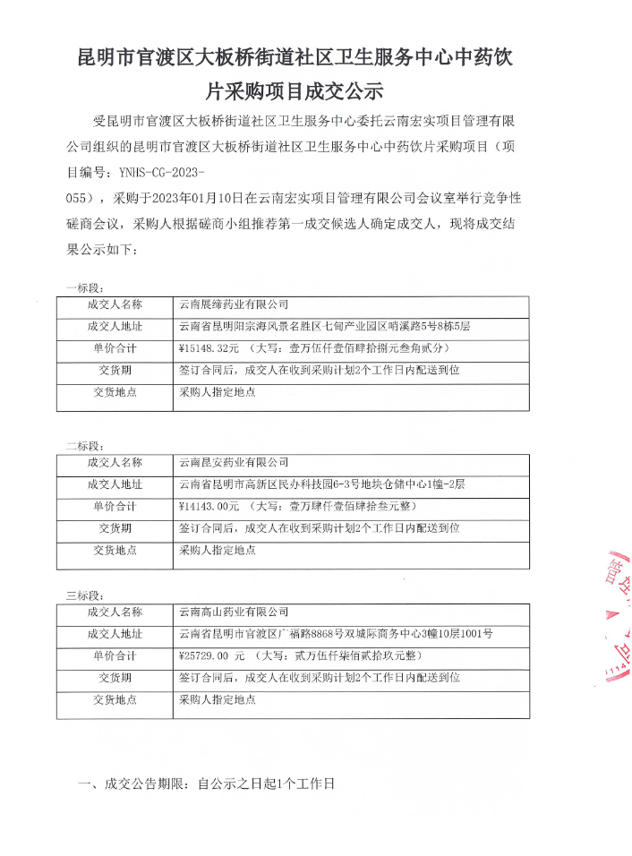 【昆明市官渡区大板桥街道社区卫生服务中心】云南省昆明市官渡区大板桥街道社区卫生服务中心中药饮片采购项目成交公示