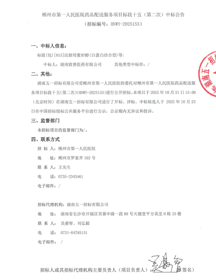 【郴州市第一人民医院】湖南省郴州市第一人民医院药品配送服务项目标段十五(第二次)中标公告