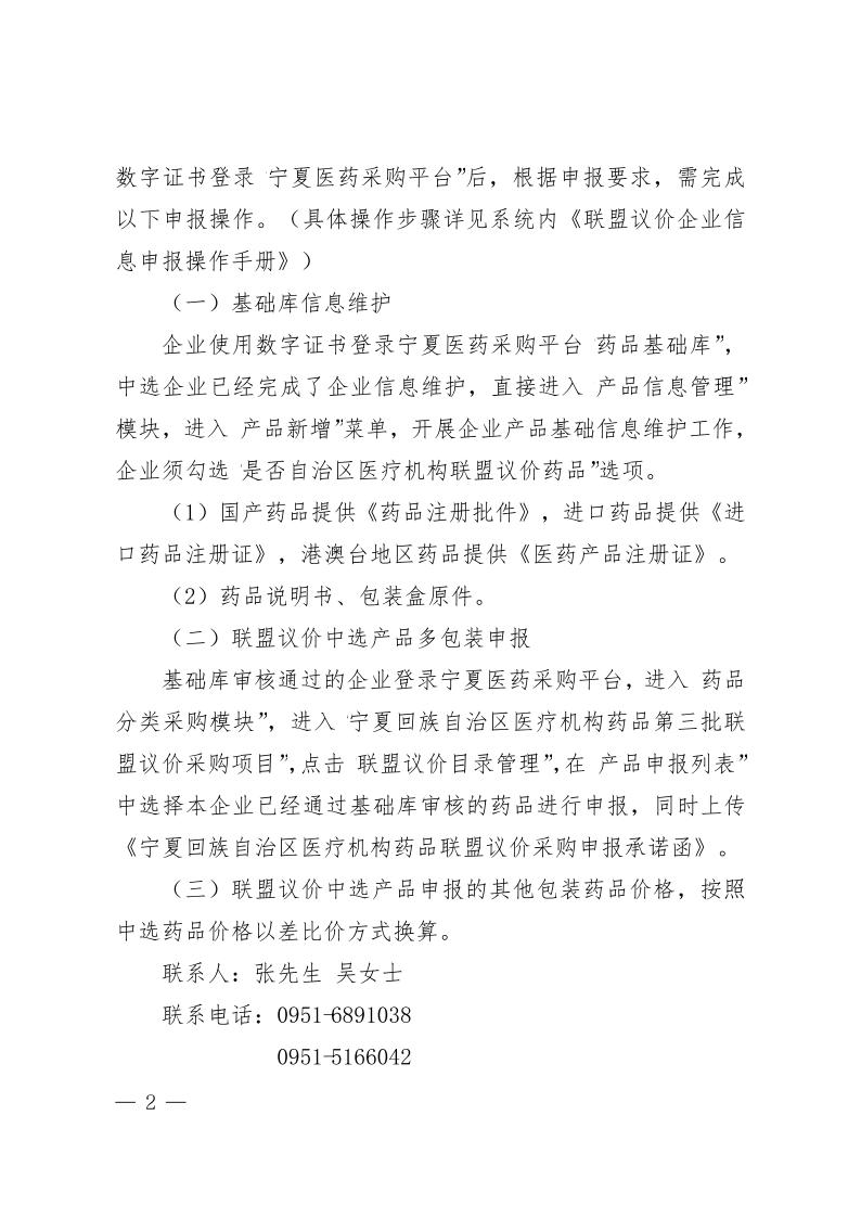 在保障供应宁夏第三批医疗机构药品联盟议价采购中选药品的前提下,中选企业可自愿申报中选药品对应的其他包装药品。