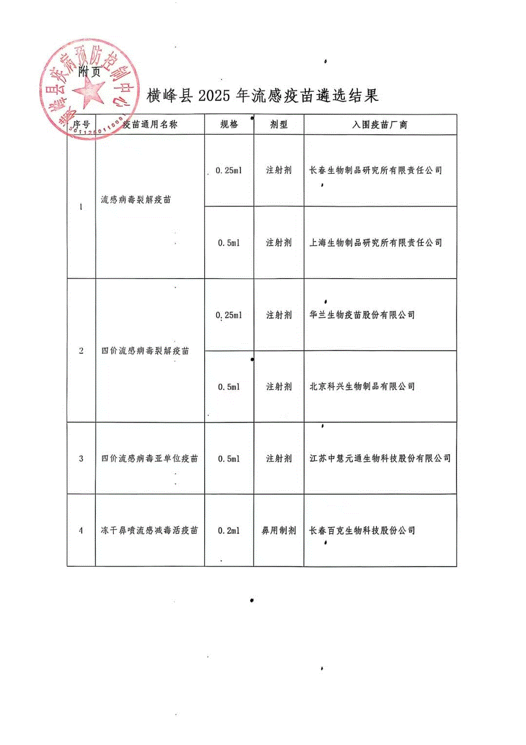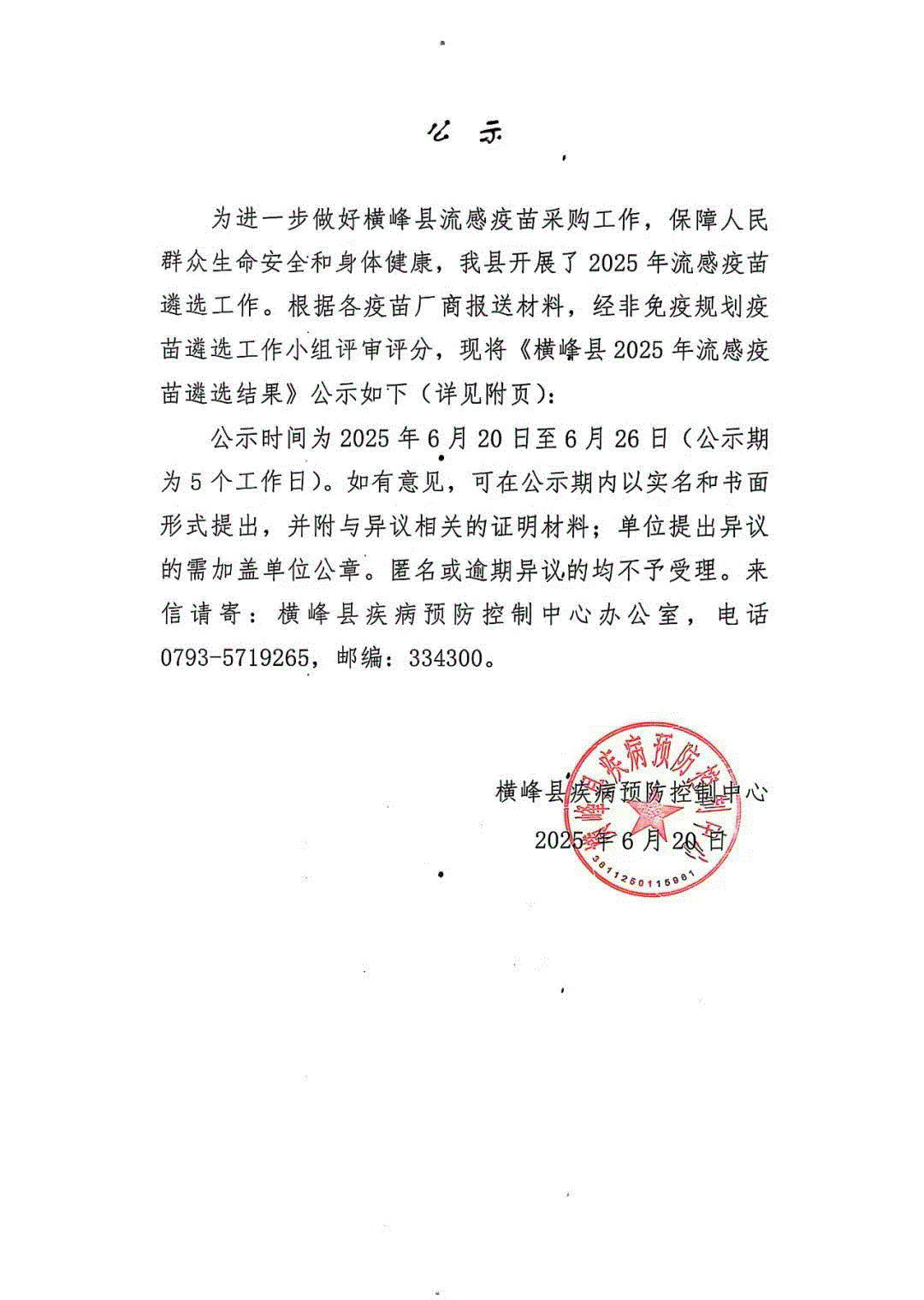 【上饶】横峰县2025年流感疫苗遴选结果公示
