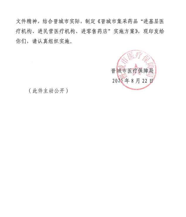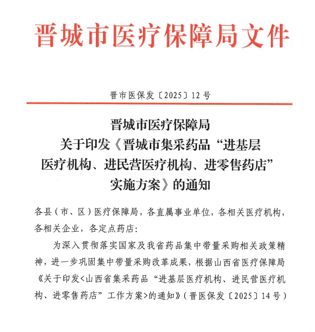 【晋城】关于印发《晋城市集采药品“进基层医疗机构、进民营医疗机构、进零售药店”实施方案》的通知
