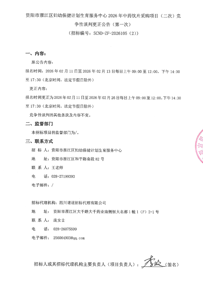 【资阳市雁江区妇幼保健计划生育服务中心】四川省资阳市雁江区妇幼保健计划生育服务中心2026年中药饮片采购项目(二次)竞争性谈判更正公告(第一次)
