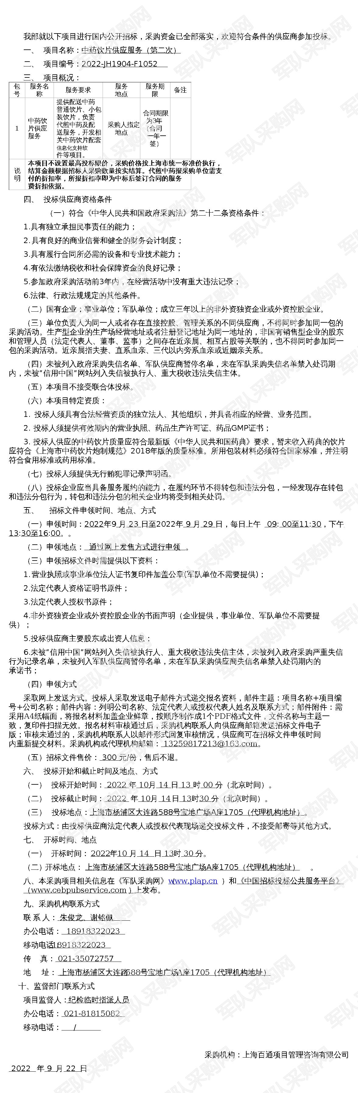 【军队采购网】中药饮片供应服务招标公告(第二次)2022-JH1904-F1052