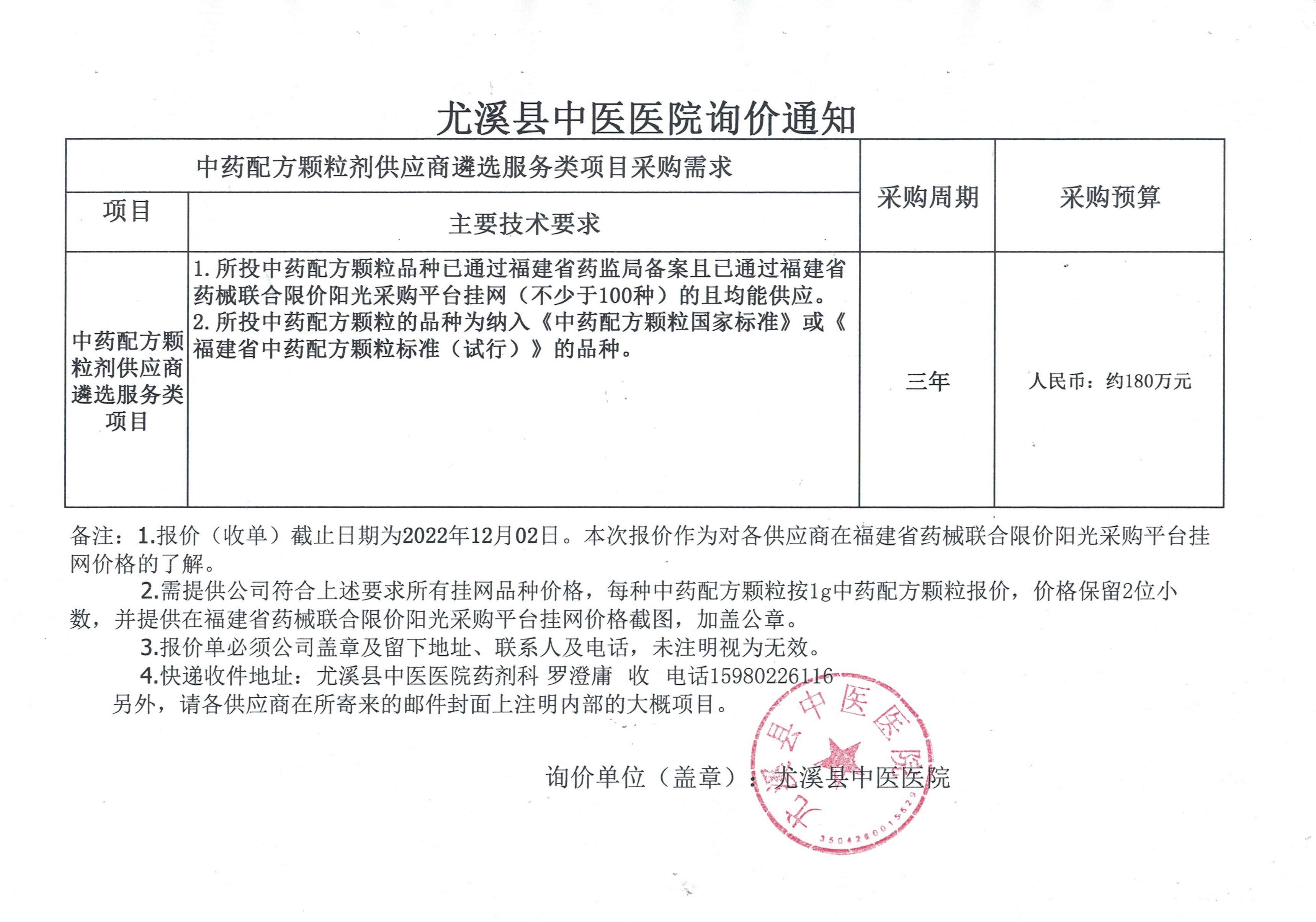 【尤溪县中医医院】福建省三明市尤溪县中医医院中药配方颗粒剂供应商遴选服务类项目采购需求