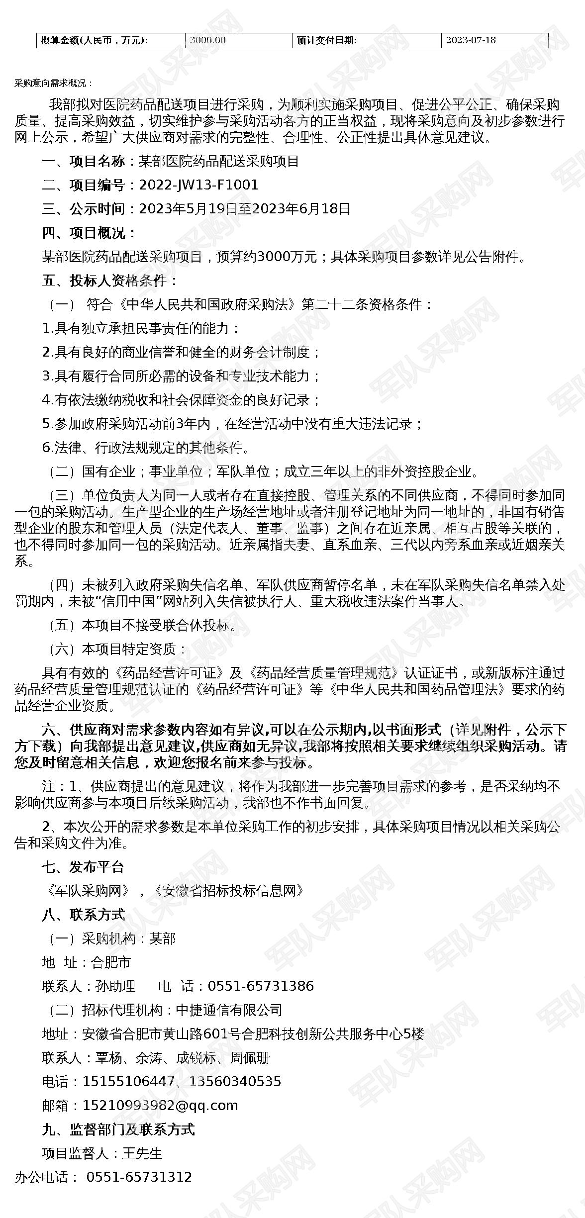 【军队采购】军队采购网某部医院药品配送采购意向及需求参数公示(2022-JW13-F1001)