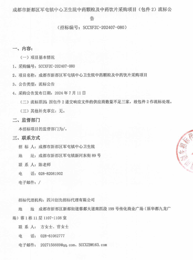 【成都市新都区军屯镇中心卫生院】四川省成都市新都区军屯镇中心卫生院中药颗粒及中药饮片采购项目(包件2)流标公告