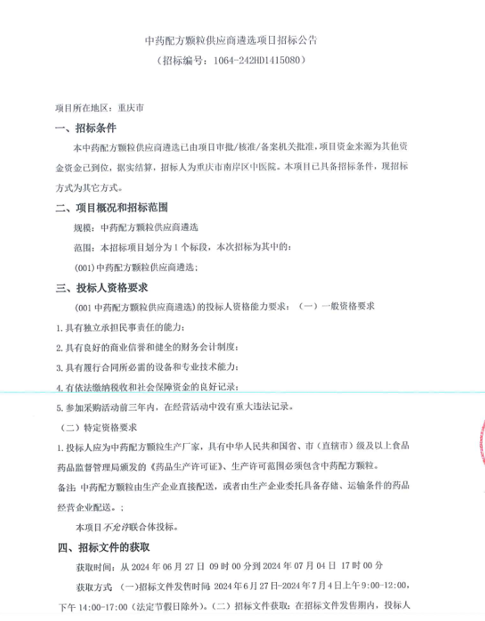 【重庆市南岸区中医院】重庆市南岸区中医院中药配方颗粒供应商遴选项目招标公告