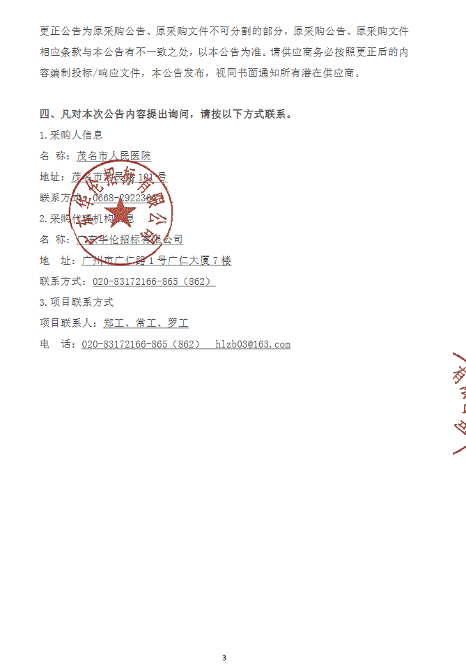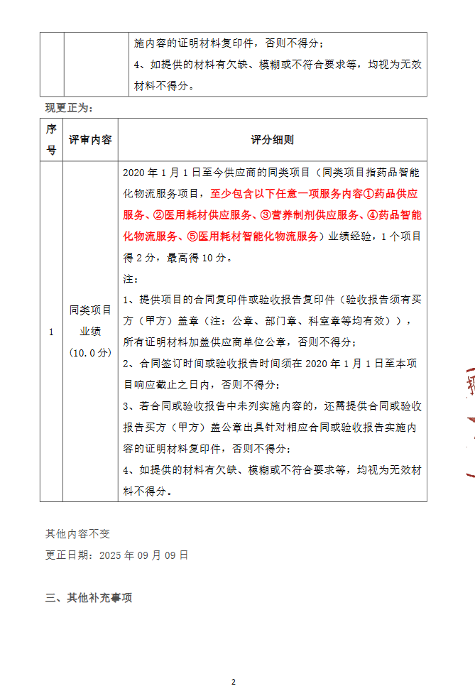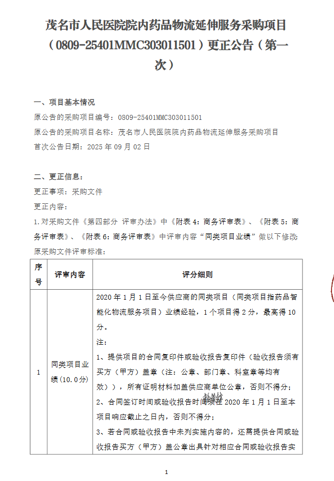【茂名市人民医院】广东省茂名市人民医院院内药品物流延伸服务采购项目(0809-25401MMC303011501)更正公告(第一次)