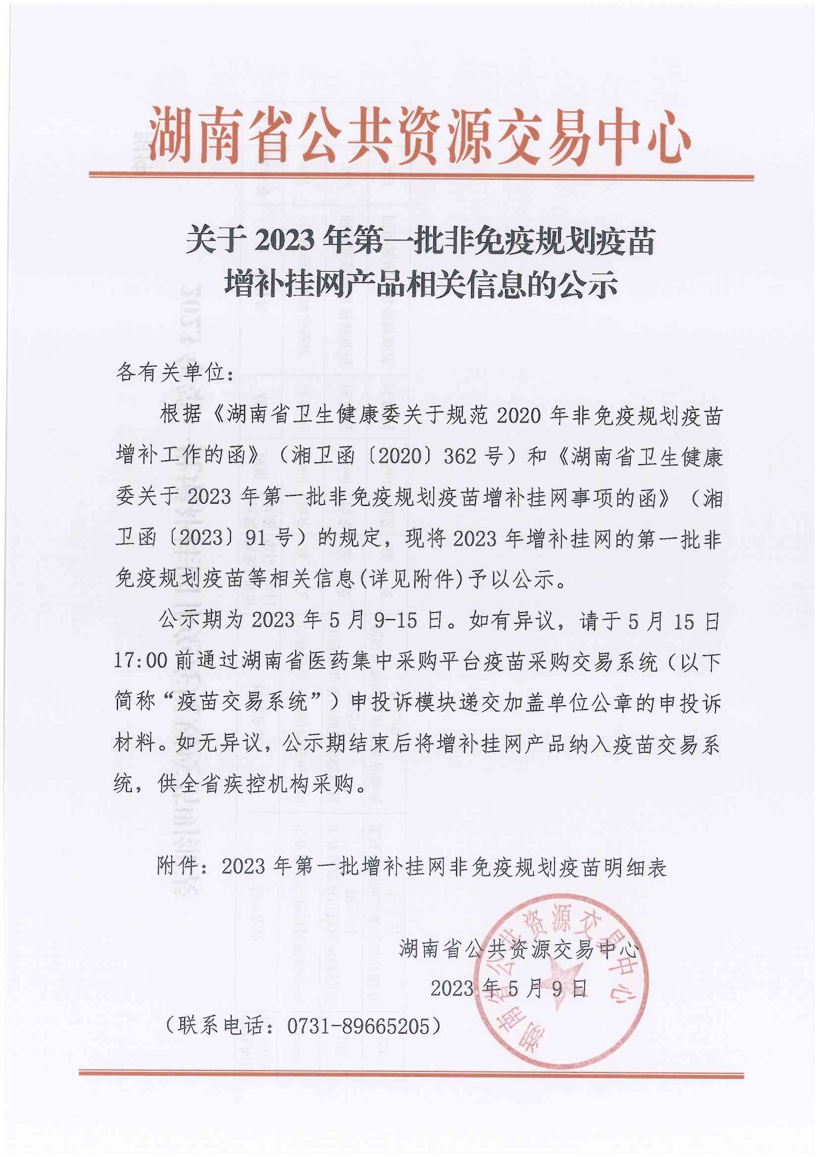 委关于2023年第一批非免疫规划疫苗增补挂网事项的函》(湘卫函〔2023〕91号〕的规定,现将2023年增补挂网的第一批非免疫规划疫苗等相关信息(详见附件)予以公示。