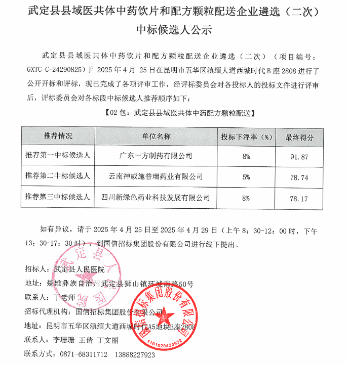 【楚雄彝族自治州武定县人民医院】云南省楚雄彝族自治州武定县县域医共体中药饮片和配方颗粒配送企业遴选(二次)中标候选人公示