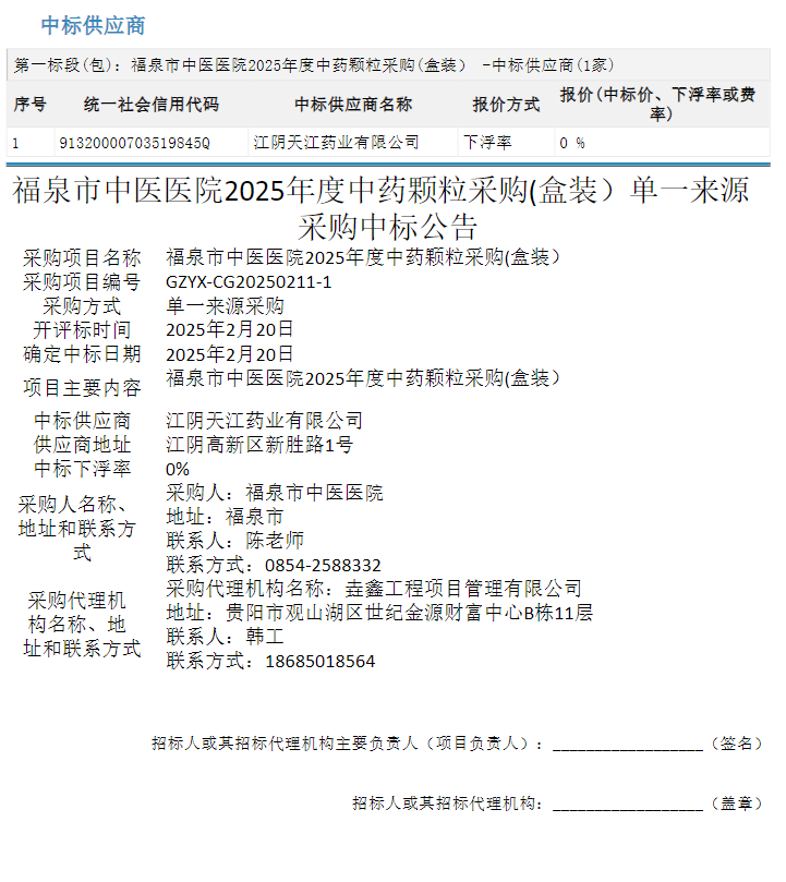 【黔南布依族苗族自治州福泉市中医医院】贵州省黔南布依族苗族自治州福泉市中医医院2025年度中药颗粒采购(盒装)单一来源采购中标公告