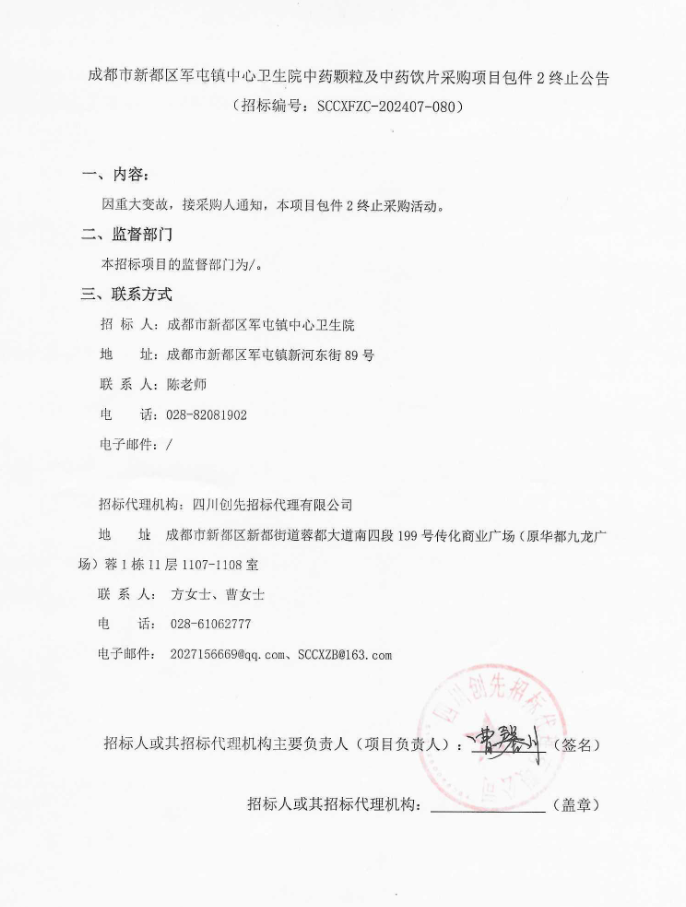 【成都市新都区军屯镇中心卫生院】四川省成都市新都区军屯镇中心卫生院中药颗粒及中药饮片采购项目包件2终止公告