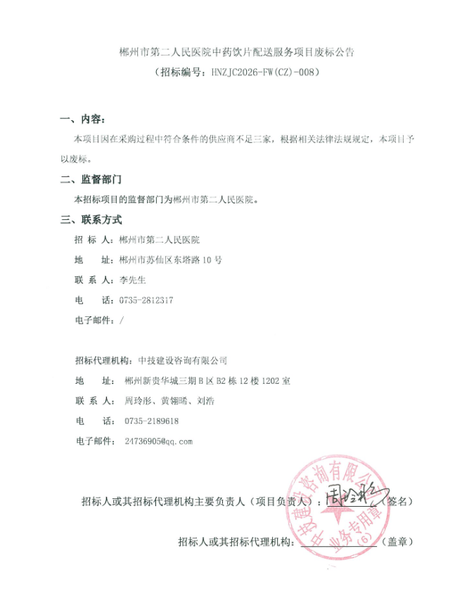 【郴州市第二人民医院】湖南省郴州市第二人民医院中药饮片配送服务项目废标公告