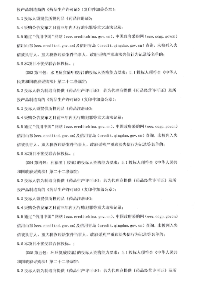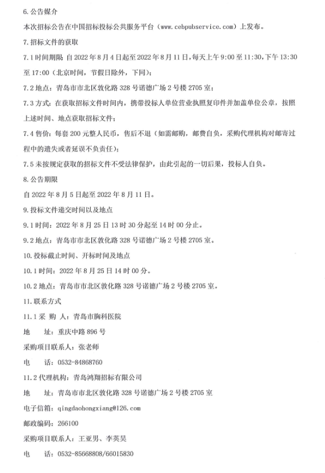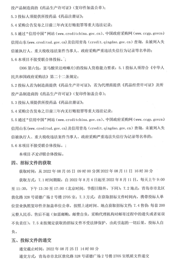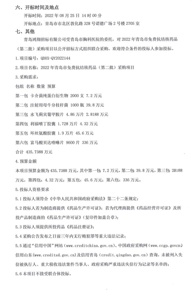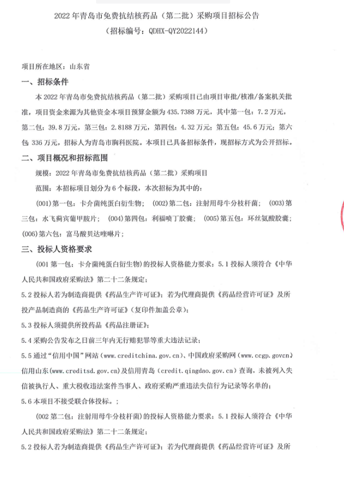 【青岛市胸科医院】2022年青岛市免费抗结核药品(第二批)采购招标公告