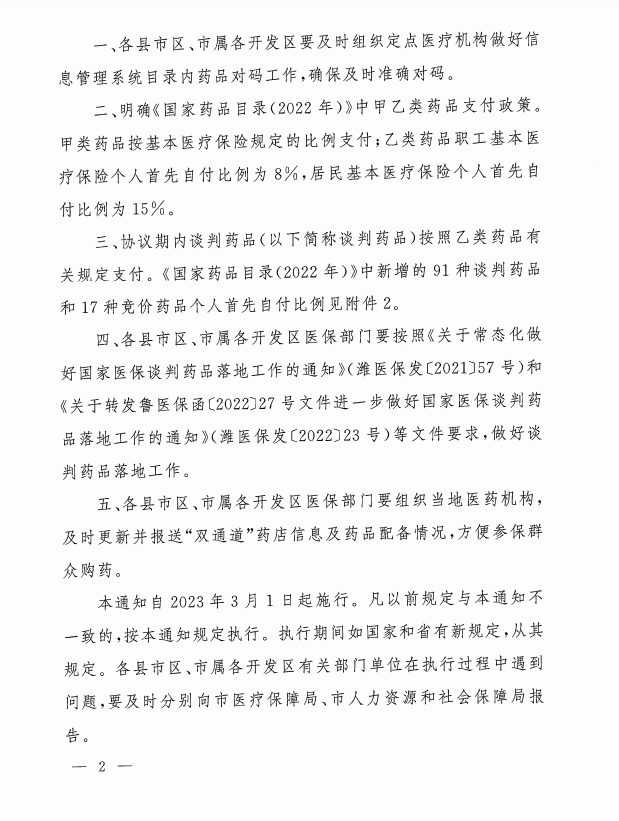 三、协议期内谈判药品(以下简称谈判药品)按照乙类药品有关规定支付。《国家药品目录(2022年)》中新增的91种谈判药品和17种竞价药品个人首先自付比例见附件2。
