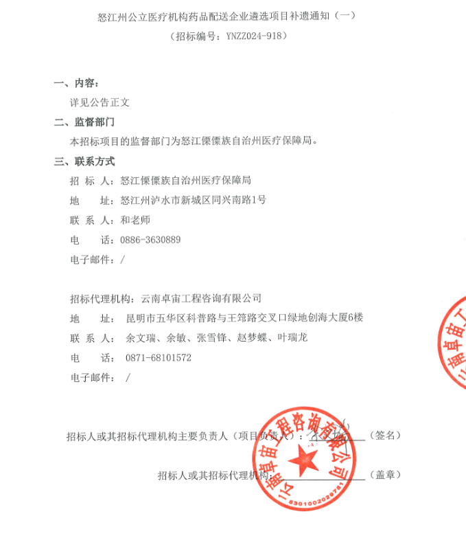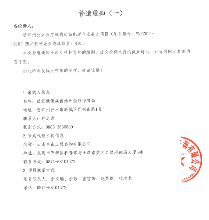 【怒江傈僳族自治州医疗保障局】云南省怒江州公立医疗机构药品配送企业遴选项目补遗通知(一)