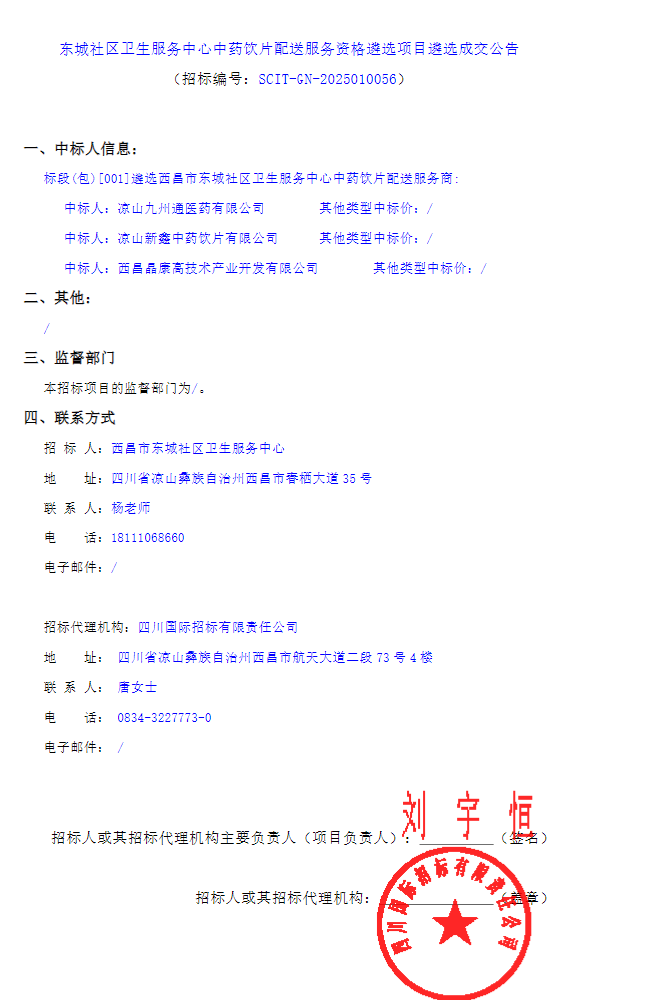 【凉山彝族自治州西昌市东城社区卫生服务中心】四川省凉山彝族自治州西昌市东城社区卫生服务中心中药饮片配送服务资格遴选项目遴选成交公告