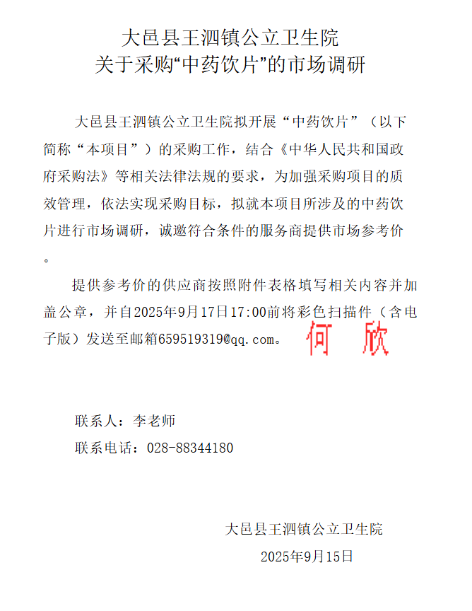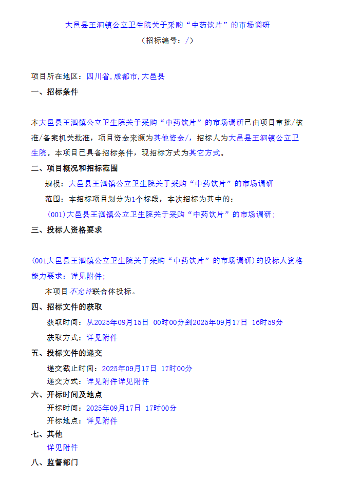 【成都市大邑县王泗镇公立卫生院】四川省成都市大邑县王泗镇公立卫生院关于采购“中药饮片”的市场调研
