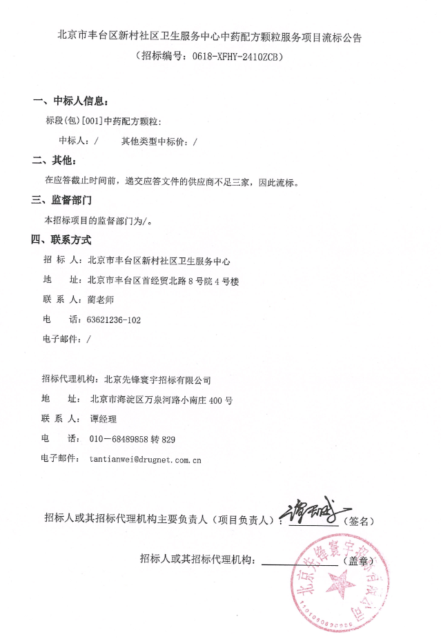 【北京市丰台区新村社区卫生服务中心】北京市丰台区新村社区卫生服务中心中药配方颗粒服务项目流标公告