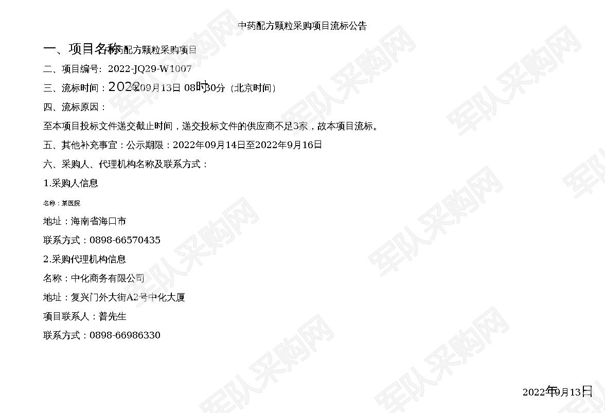 【军队采购网】中药配方颗粒采购项目流标公告2022-JQ29-W1007