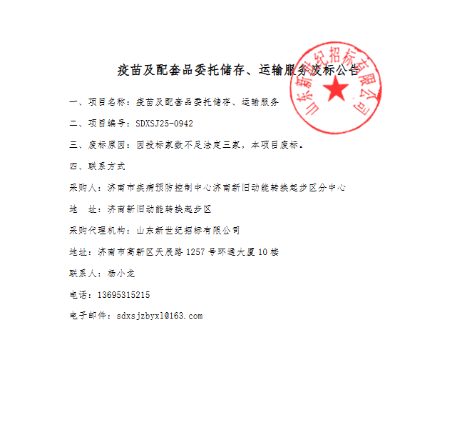 【济南市疾病预防控制中心】山东省济南市疾病预防控制中心济南新旧动能转换起步区分中心疫苗及配套品委托储存、运输服务废标公告