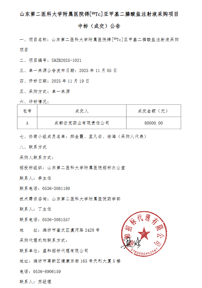 【山东第二医科大学附属医院】山东第二医科大学附属医院锝〔99Tc〕亚甲基二膦酸盐注射液采购项目中标(成交)公告