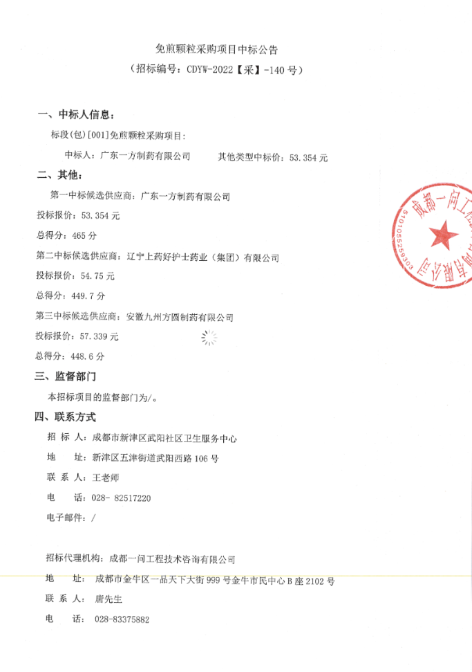 【四川省成都市新津县武阳社区服务中心】免煎颗粒采购项目中标公告