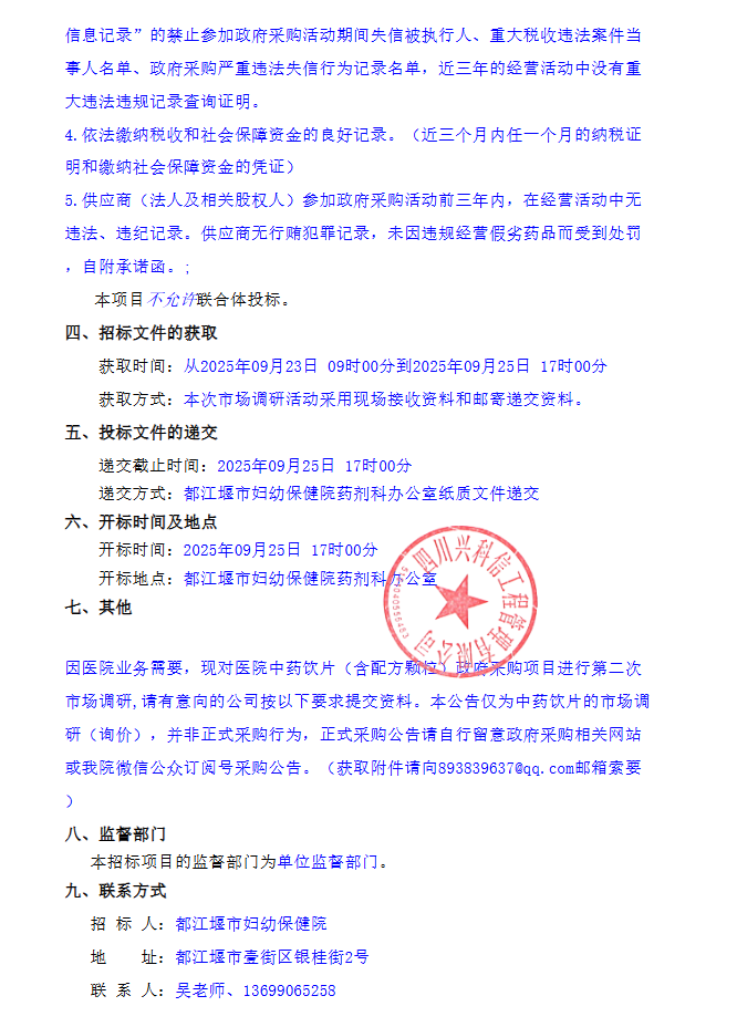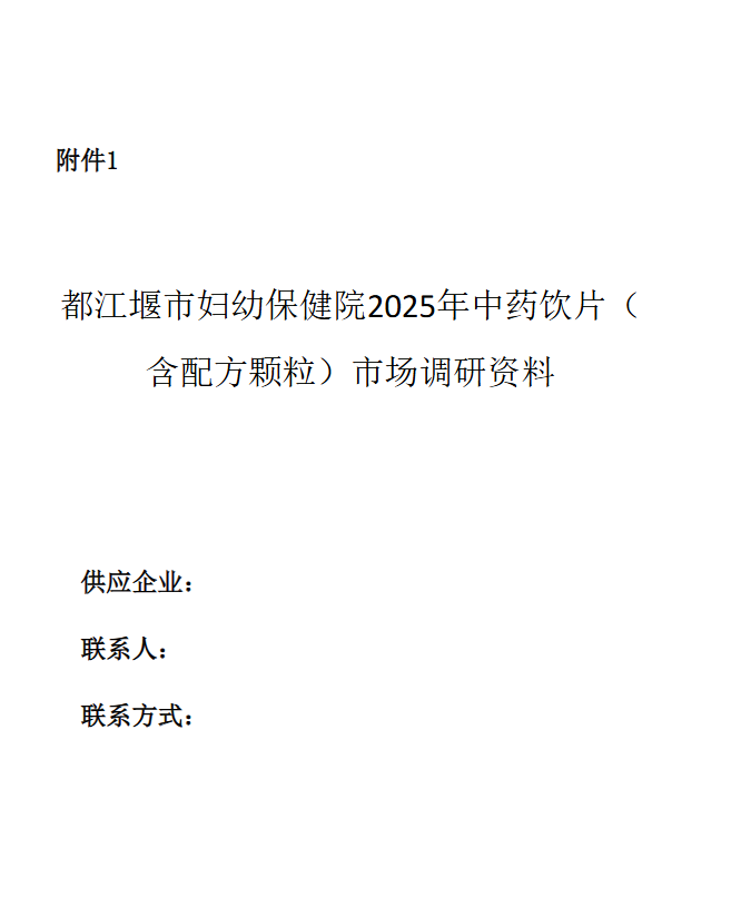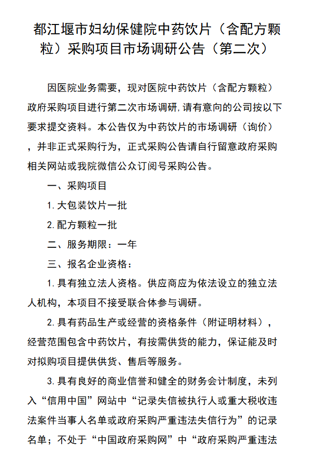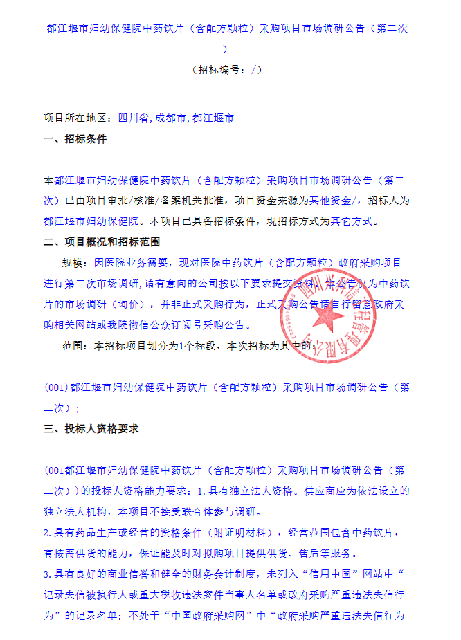 【成都市都江堰市妇幼保健院】四川省都江堰市妇幼保健院中药饮片(含配方颗粒)采购项目市场调研公告(第二次)