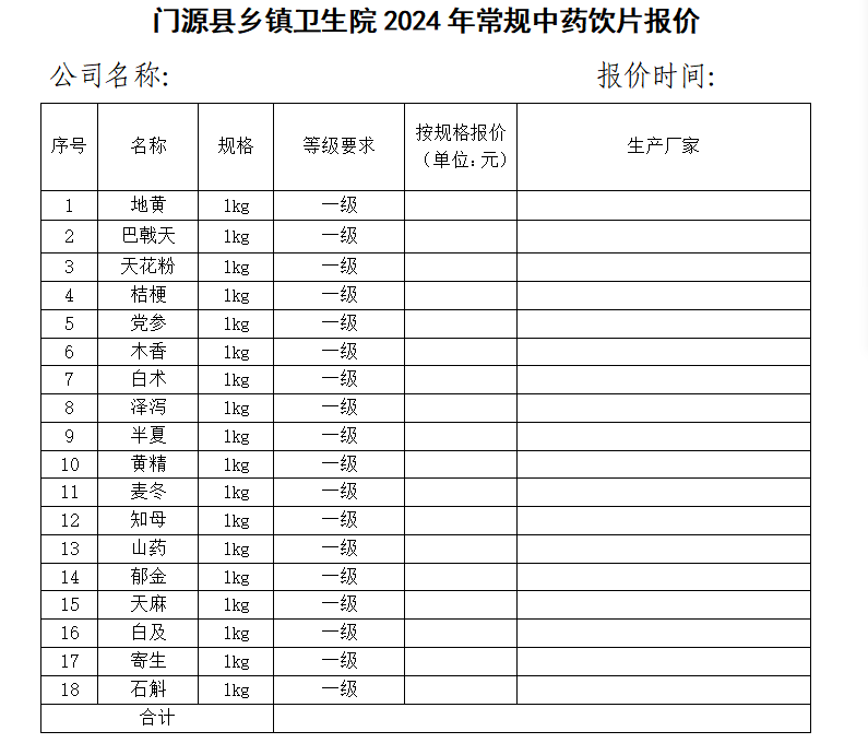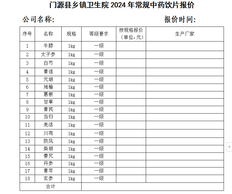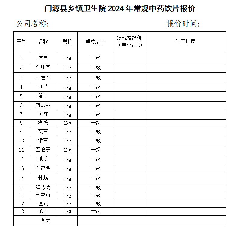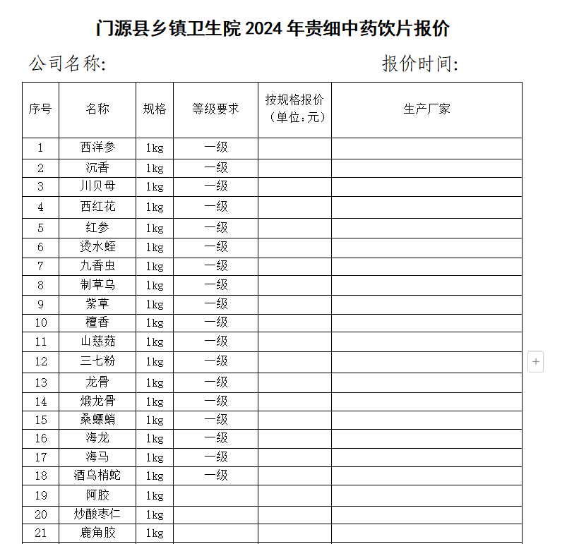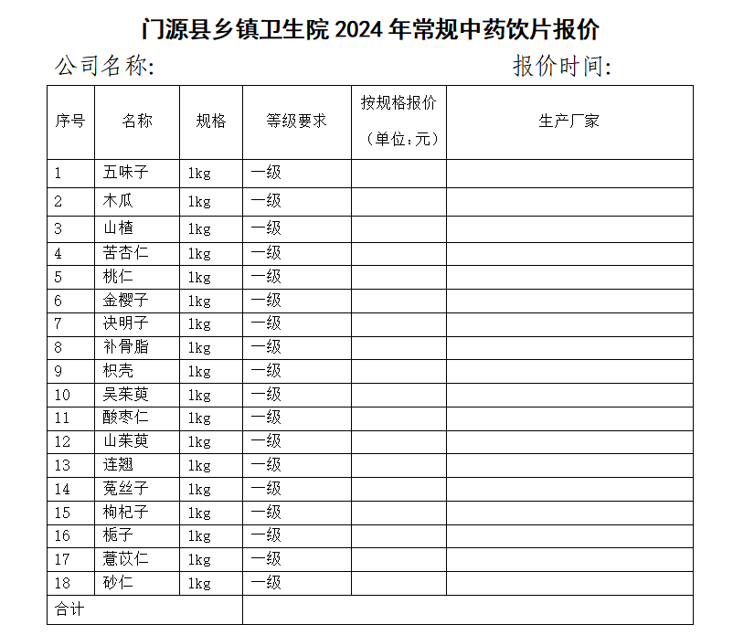 为进一步加强和规范门源县乡镇卫生院中药饮片的采购及临床使用管理工作,保障人民用药安全、有效、降低中药饮片价格,减轻患者负担。根据《药品管理法》《医院中药饮片质量管理规范》等有关法律、法规相关要求,结合中药饮片质量管理自身规律,经各乡镇卫生院商讨报门源县医共体总院研究决定,对门源县乡镇卫生院中药饮片进行公开议价及供应商遴选。