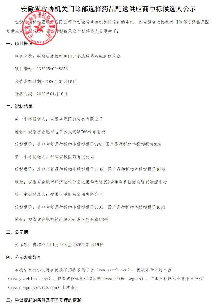 【安徽省政协机关门诊部】安徽省政协机关门诊部选择药品配送供应商中标候选人公示