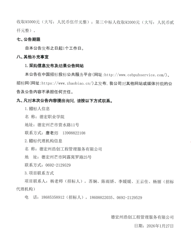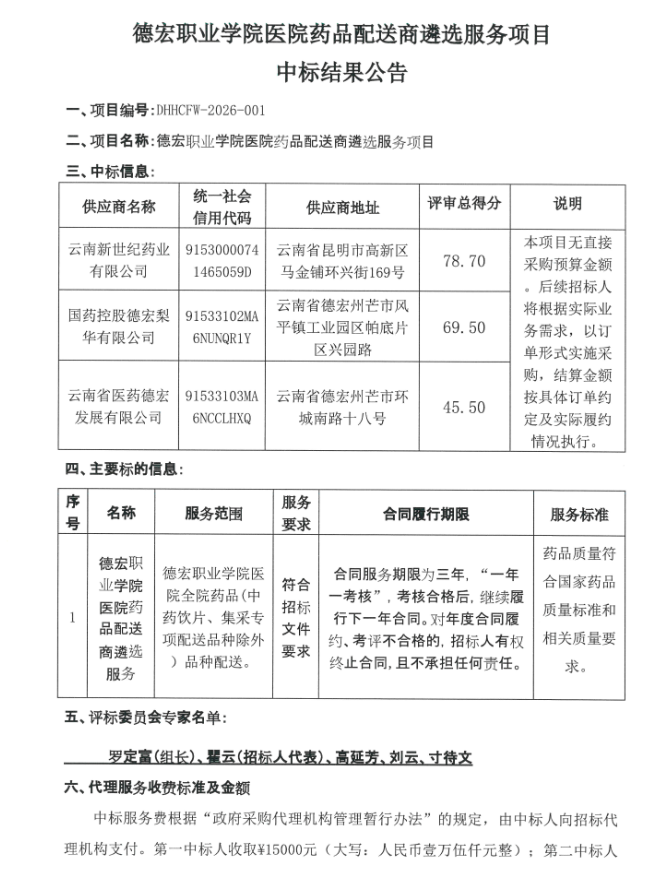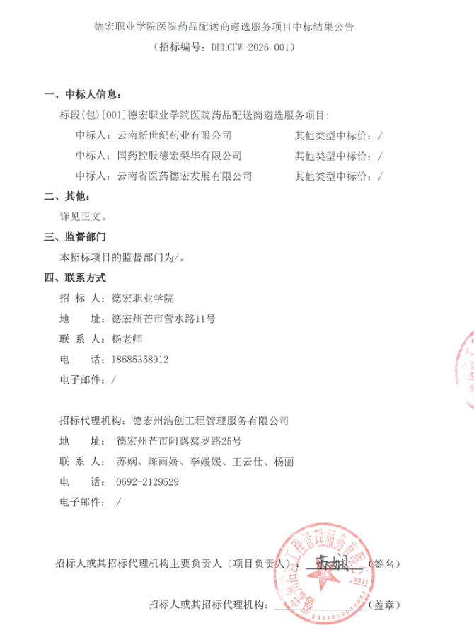 【德宏职业学院】云南省德宏职业学院医院药品配送商遴选服务项目中标结果公告