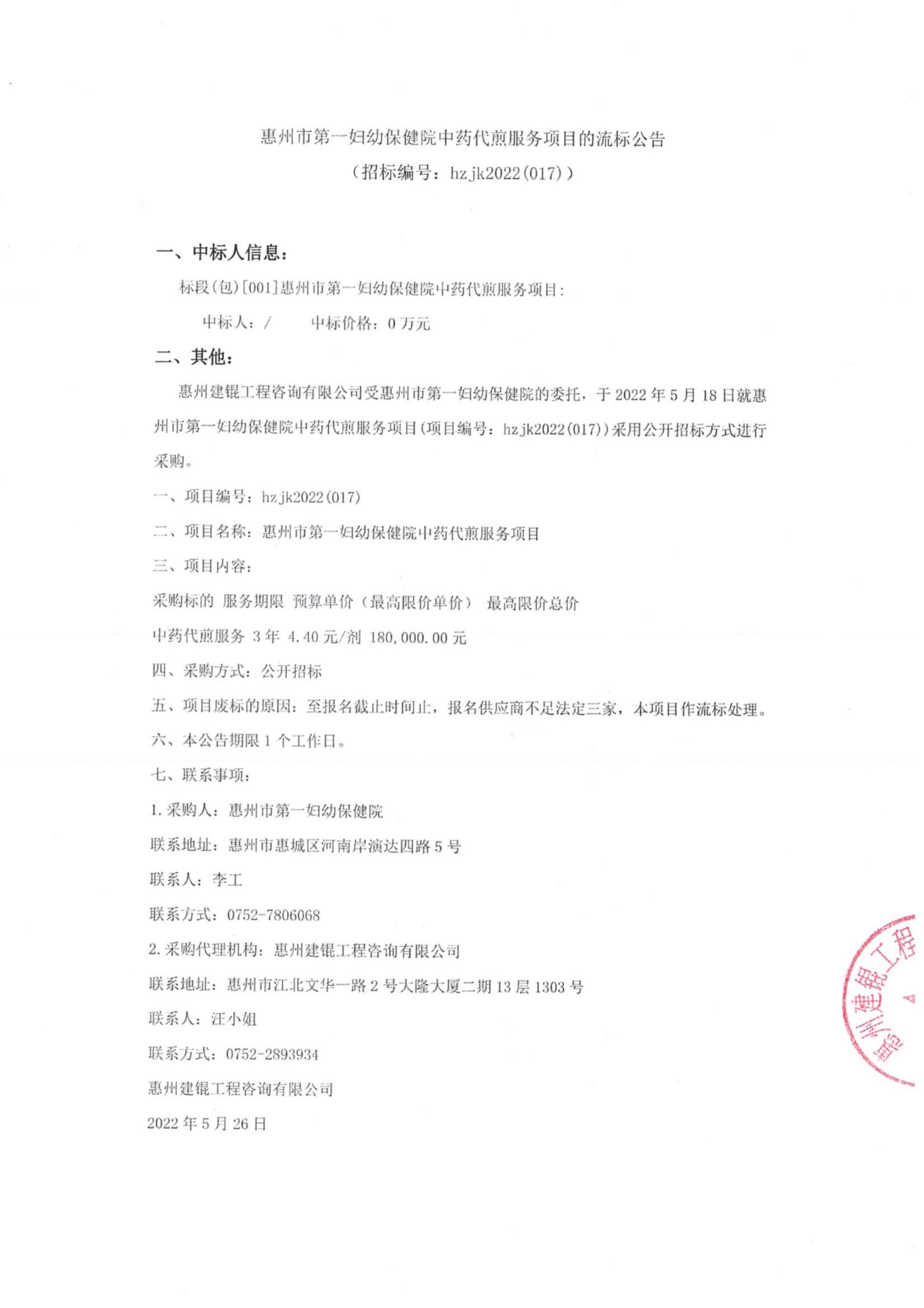 【惠州市第一妇幼保健院】广东惠州市第一妇幼保健院中药代煎服务的流标公告