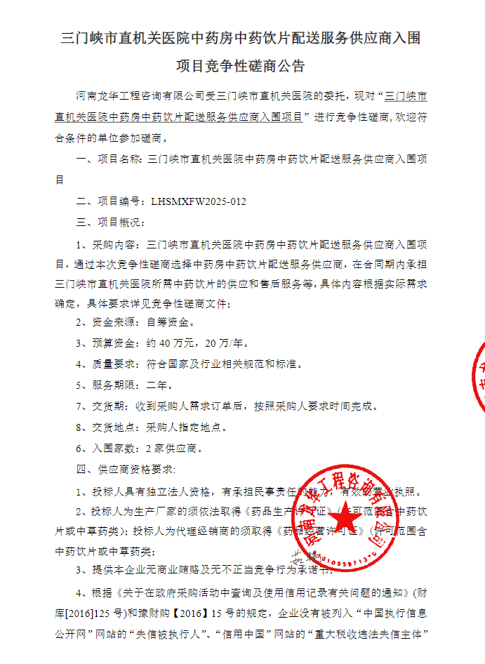 【三门峡市直机关医院】河南省三门峡市直机关医院中药房中药饮片配送服务供应商入围项目-竞争性磋商公告