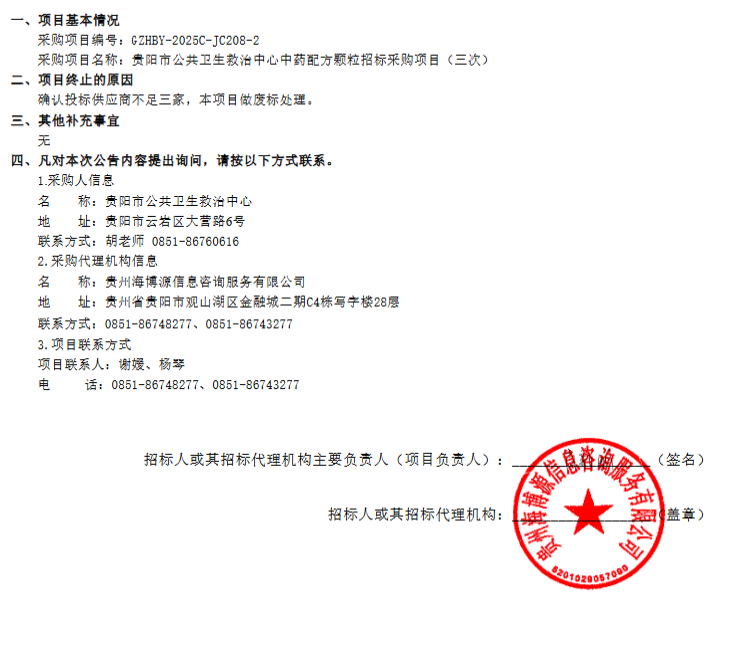 【贵阳市公共卫生救治中心】贵州省贵阳市公共卫生救治中心中药配方颗粒招标采购项目(三次)终止公告