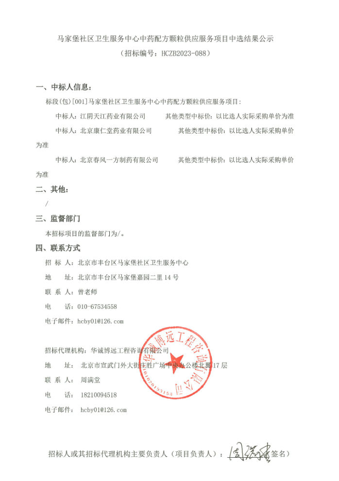 【北京市丰台区马家堡社区卫生服务中心】北京市丰台区马家堡社区卫生服务中心中药配方颗粒供应服务项目中选结果公示