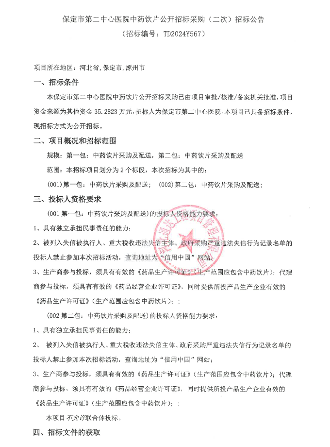 【保定市第二中心医院】河北省保定市第二中心医院中药饮片公开招标采购(二次)招标公告
