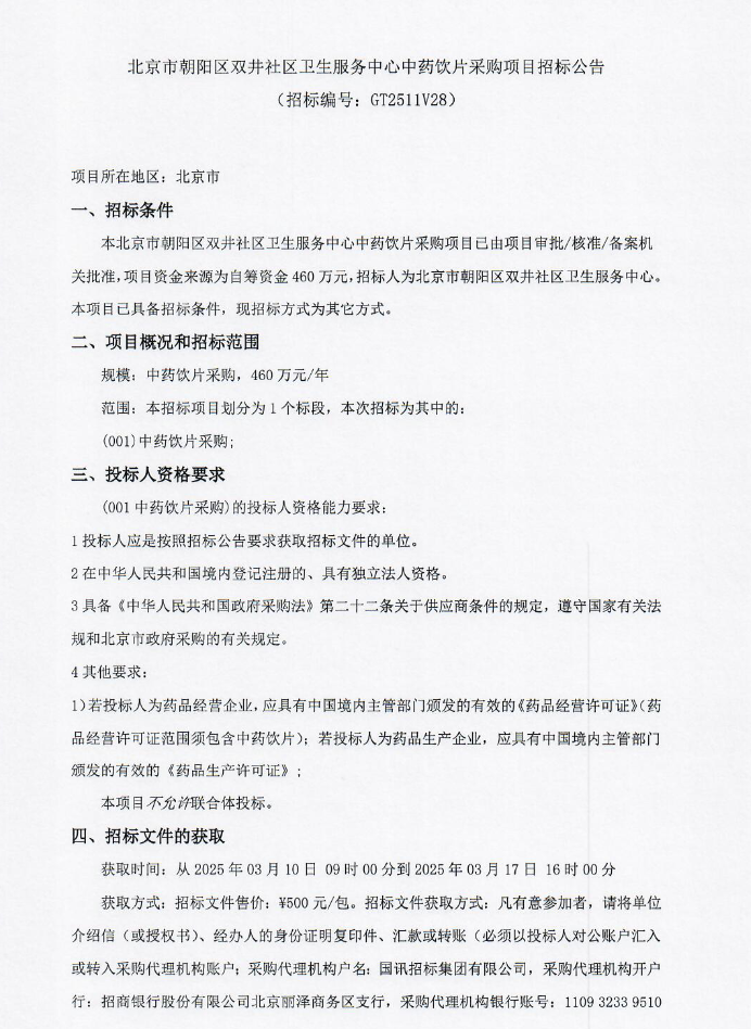 【北京市朝阳区双井社区卫生服务中心】北京市朝阳区双井社区卫生服务中心中药饮片采购项目招标公告