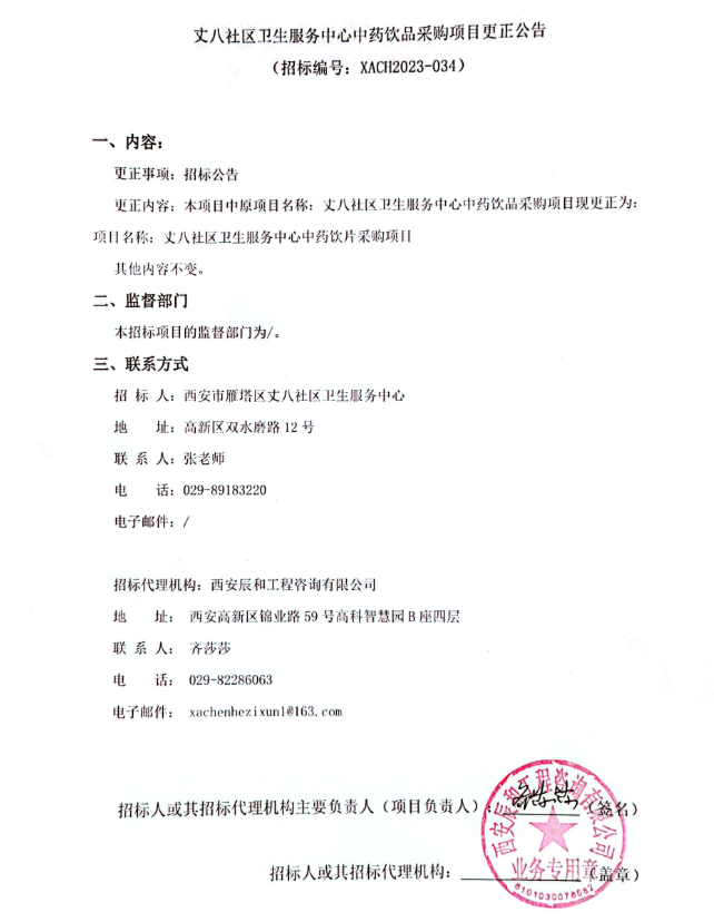 【西安市雁塔区丈八社区卫生服务中心】陕西省西安市雁塔区丈八社区卫生服务中心中药饮品采购项目更正公告