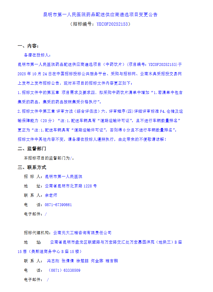 【昆明市第一人民医院】云南省昆明市第一人民医院药品配送供应商遴选项目变更公告