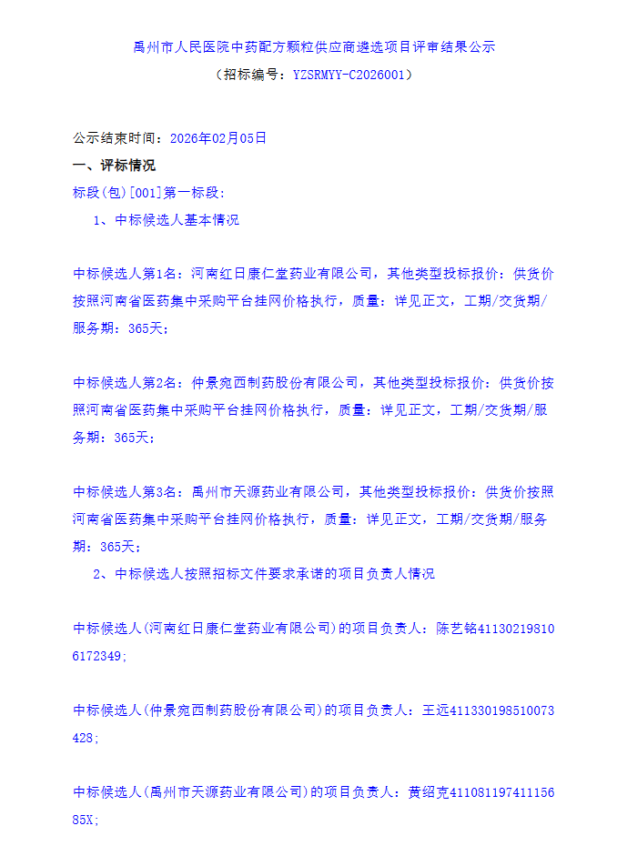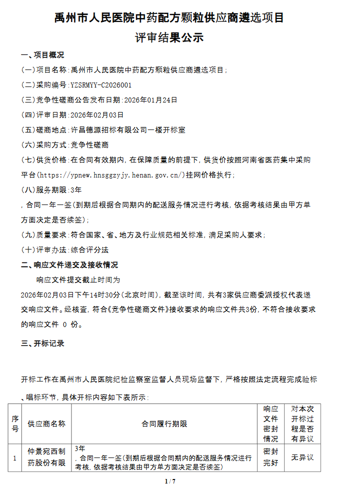 【许昌市禹州市人民医院】河南省禹州市人民医院中药配方颗粒供应商遴选项目评审结果公示