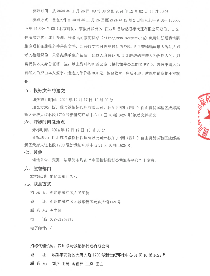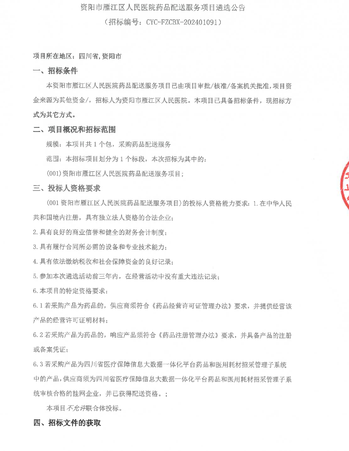 【资阳市雁江区人民医院】四川省资阳市雁江区人民医院药品配送服务项目遴选公告