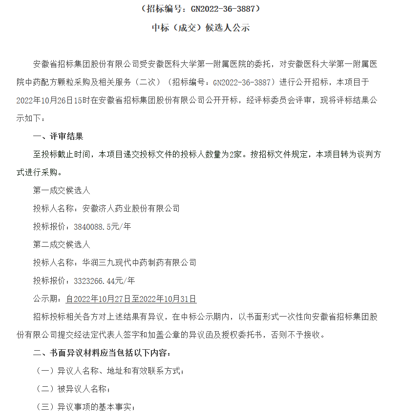 【安徽医科大学第一附属医院】中药配方颗粒采购及相关服务中标候选人公示