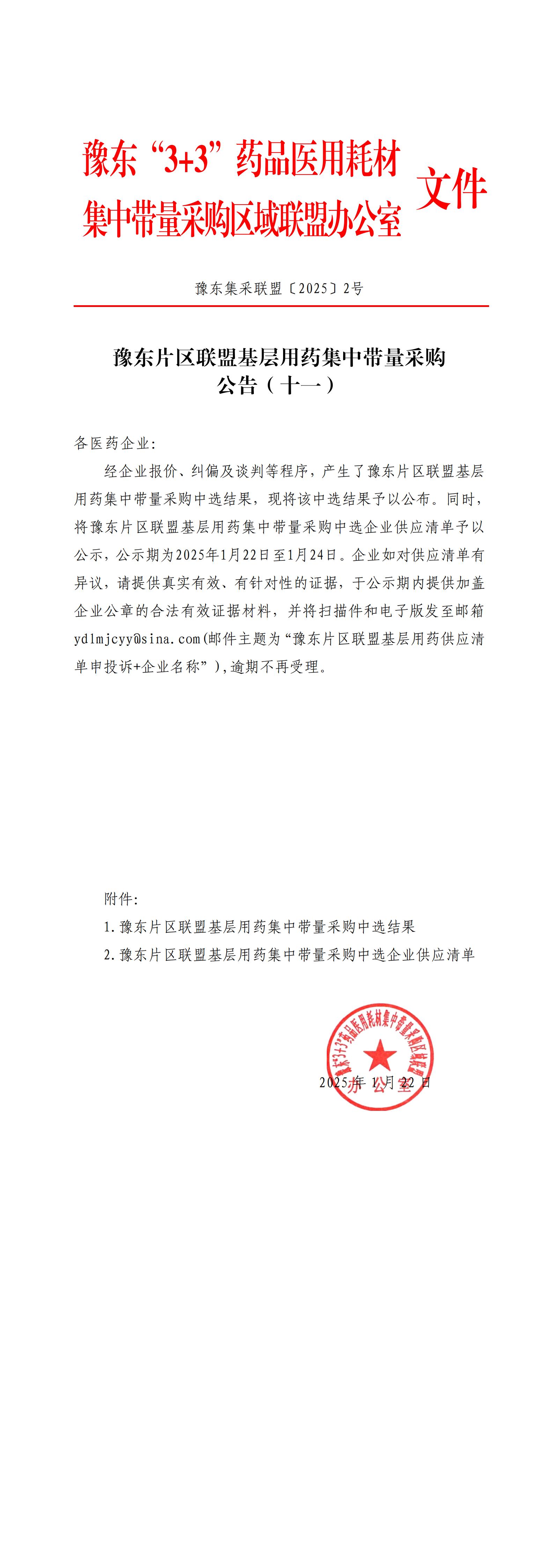 经企业报价、纠偏及谈判等程序,产生了豫东片区联盟基层用药集中带量采购中选结果,现将该中选结果予以公布。同时,将豫东片区联盟基层用药集中带量采购中选企业供应清单予以公示,公示期为2025年1月22日至1月24日。企业如对供应清单有异议,请提供真实有效、有针对性的证据,于公示期内提供加盖企业公章的合法有效证据材料,并将扫描件和电子版发至邮箱yd1mjcyyasina.com(邮件主题为“豫东片区联盟基层用药供应清单申投诉+企业名称”),逾期不再受理。