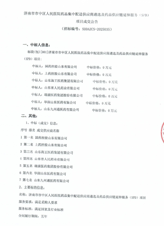 【济南市市中区人民医院】山东省济南市市中区人民医院药品集中配送供应商遴选及药品供应链延伸服务(SPD)项目成交公告