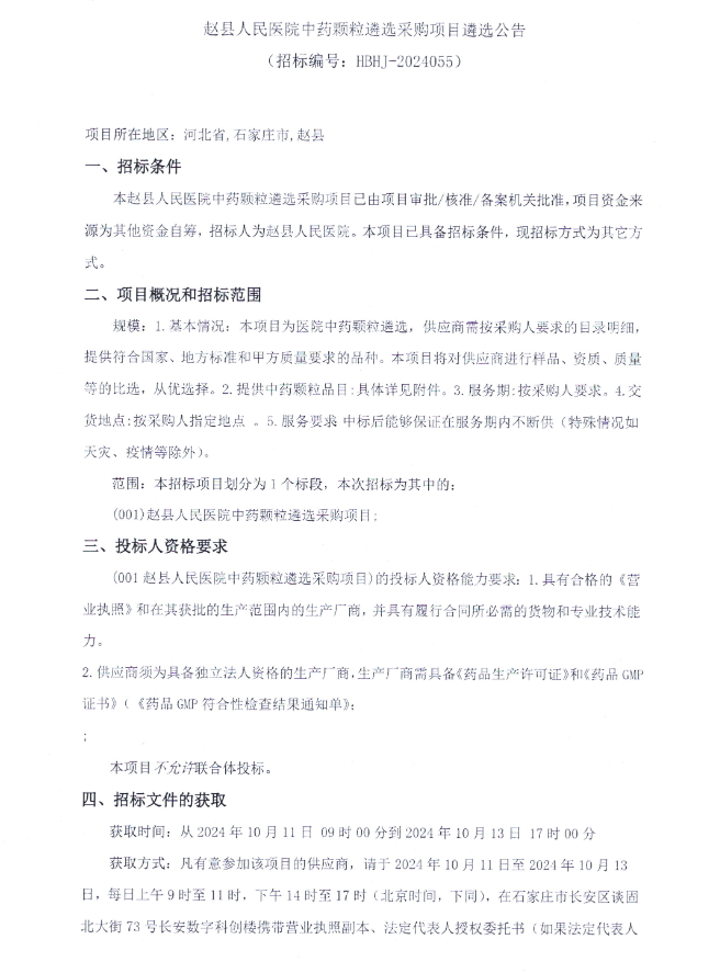 【石家庄市赵县人民医院】河北省石家庄市赵县人民医院中药颗粒遴选采购项目遴选公告