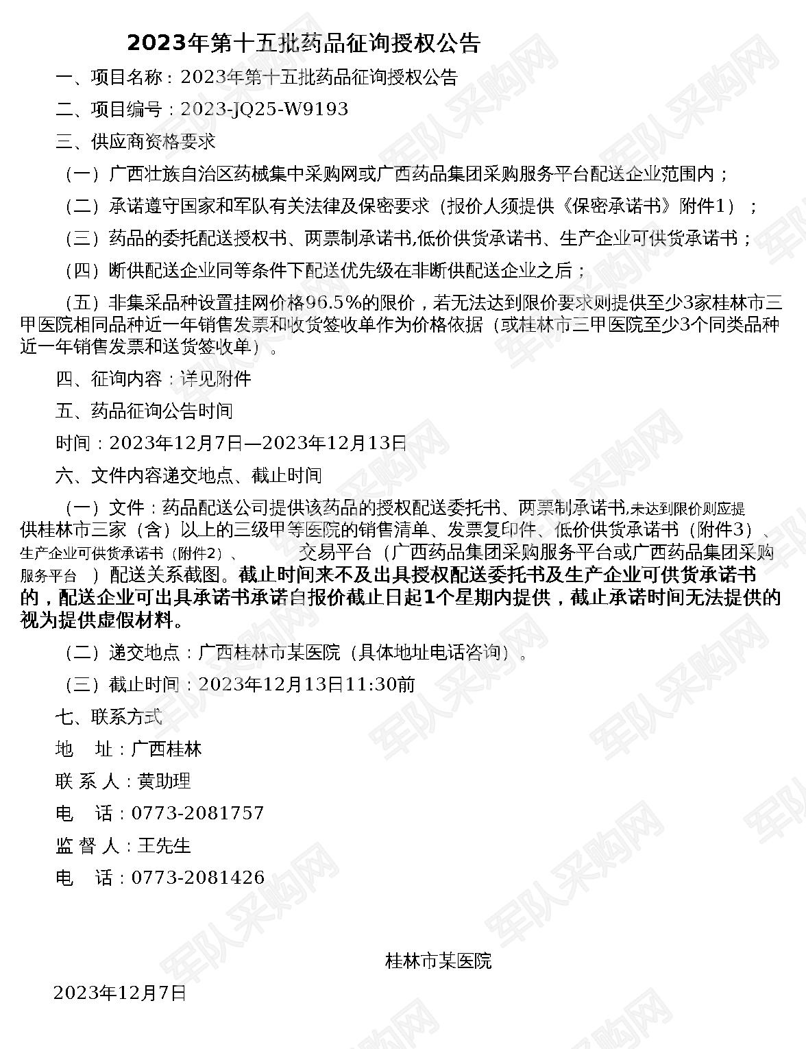 【军队采购】军队采购网2023年第十五批药品征询授权公告(2023-JQ25-W9193)