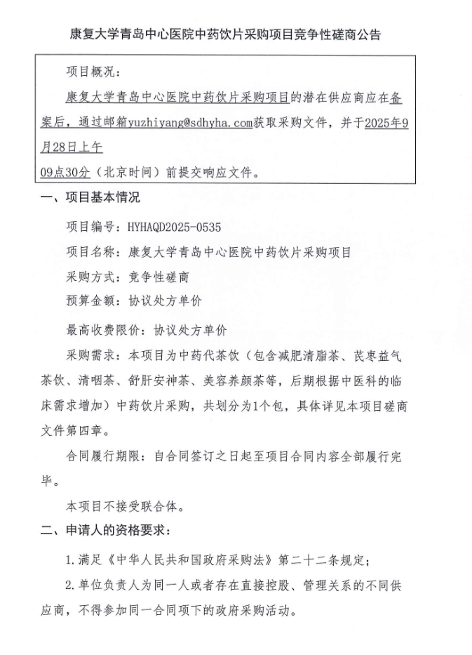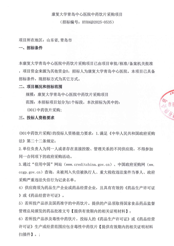 【青岛市中心医院】山东省康复大学青岛中心医院中药饮片采购项目
